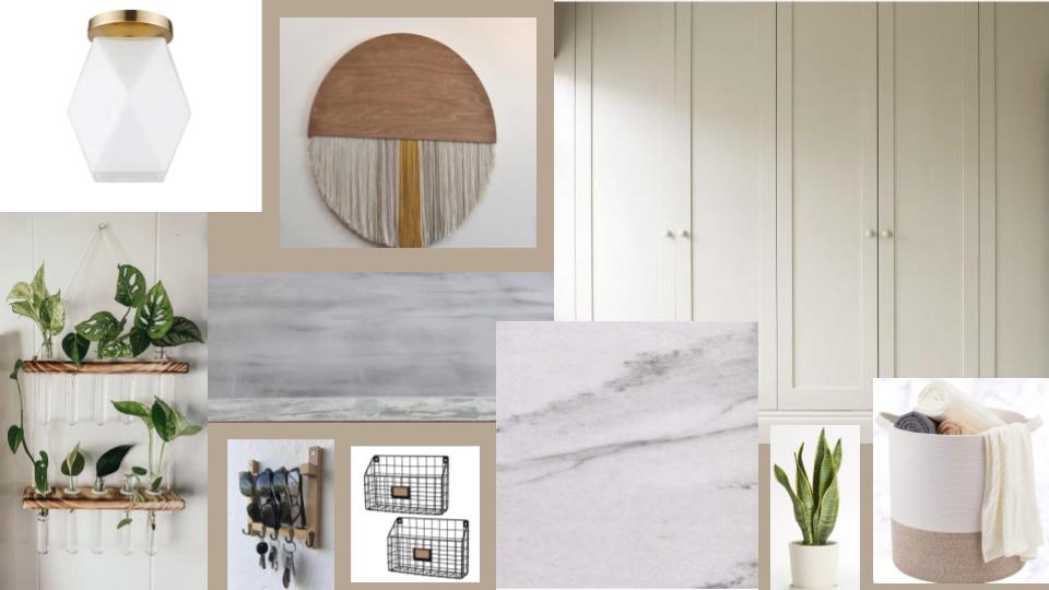 My thoughts for this space are to keep it bright & clean. Keep the storage closed, and provide some design elements with flooring, plants, lighting, & of course decor. I want this to be a peaceful space. When I come into the house at the end of a long day, I want this space to give a calm hug instead of a stressed out stomachache.