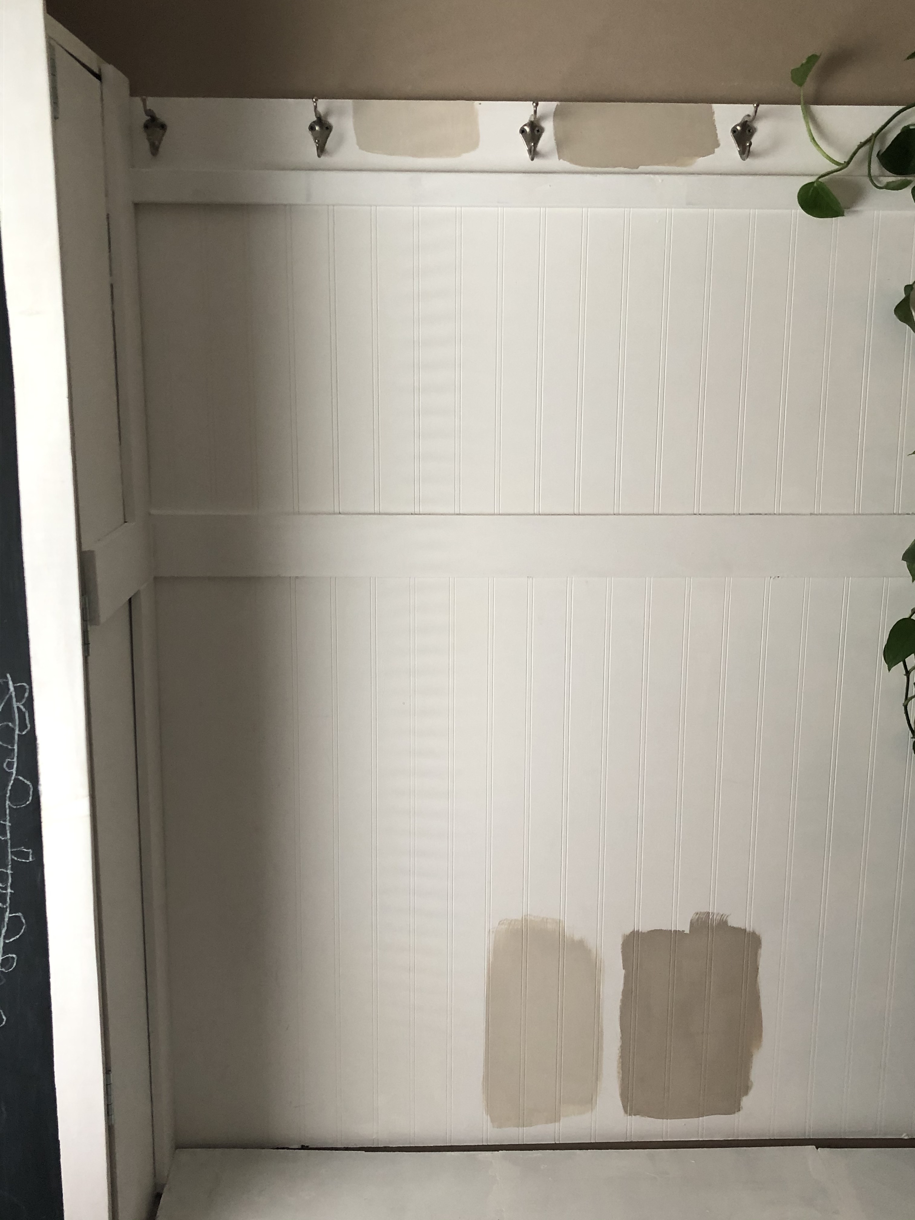With cabinet painting, I decided everything needed to be one cohesive color for simplicity. This includes the mudroom bench/space, the cabinets under the countertop, and my brand new built-ins. Originally, I had planned to paint everything a bright white, but as the weeks went on in this challenge, I started thinking that it might feel too cold. Since I was unsure, I decided to buy a few paint samples, and ending up choosing Sandstone Tint by Dutch Boy in a satin finish.