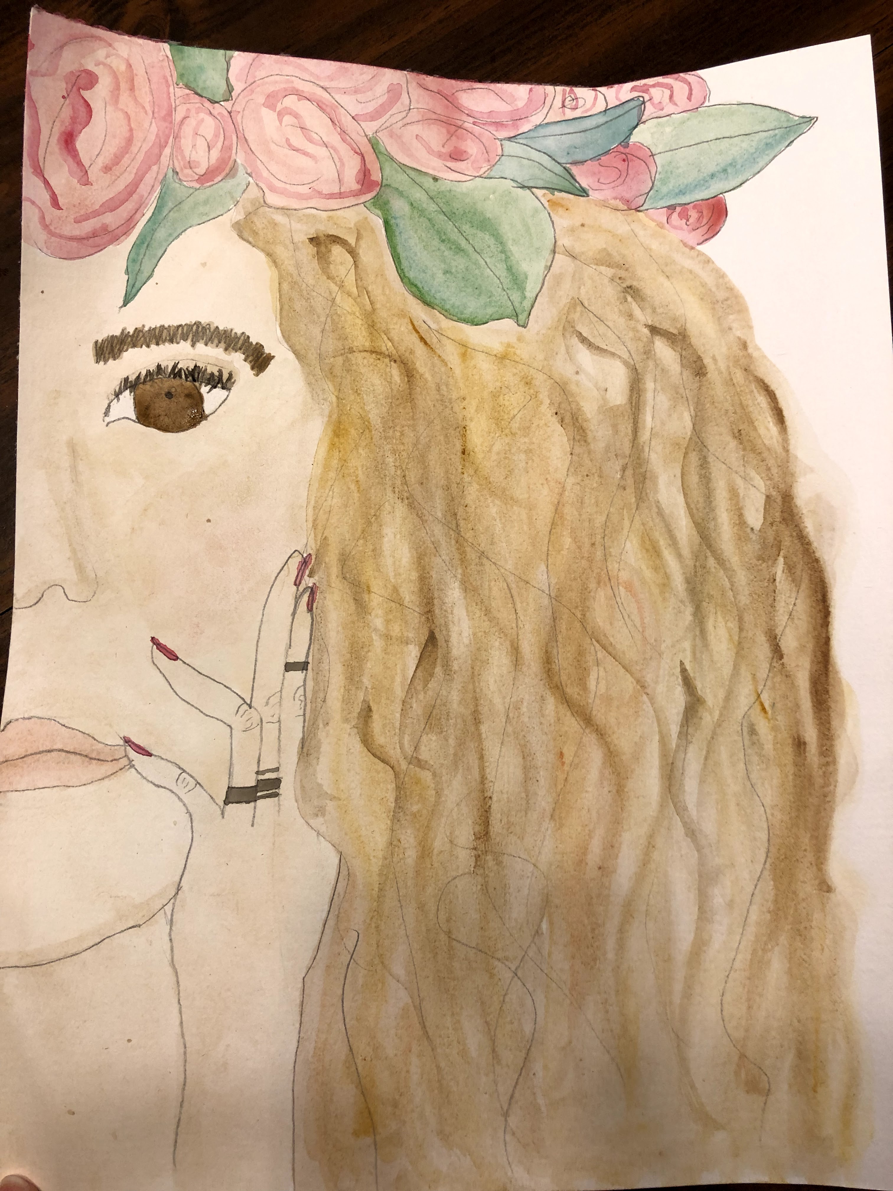 The next piece to highlight in this space is the watercolor on the wood frame. Watercolors are one of my other creative loves. I’m not an expert, and most of the time I paint pieces just for me, but I love it. I’ll put on a vinyl record, grab my cup of hot tea, & paint for a few hours. I mostly paint plants, because they’re easier for me, but I have done a few portraits of people & animals. Check out my self-portrait below. I made a simple wood frame so that I can change out the watercolor if I want to in different seasons.