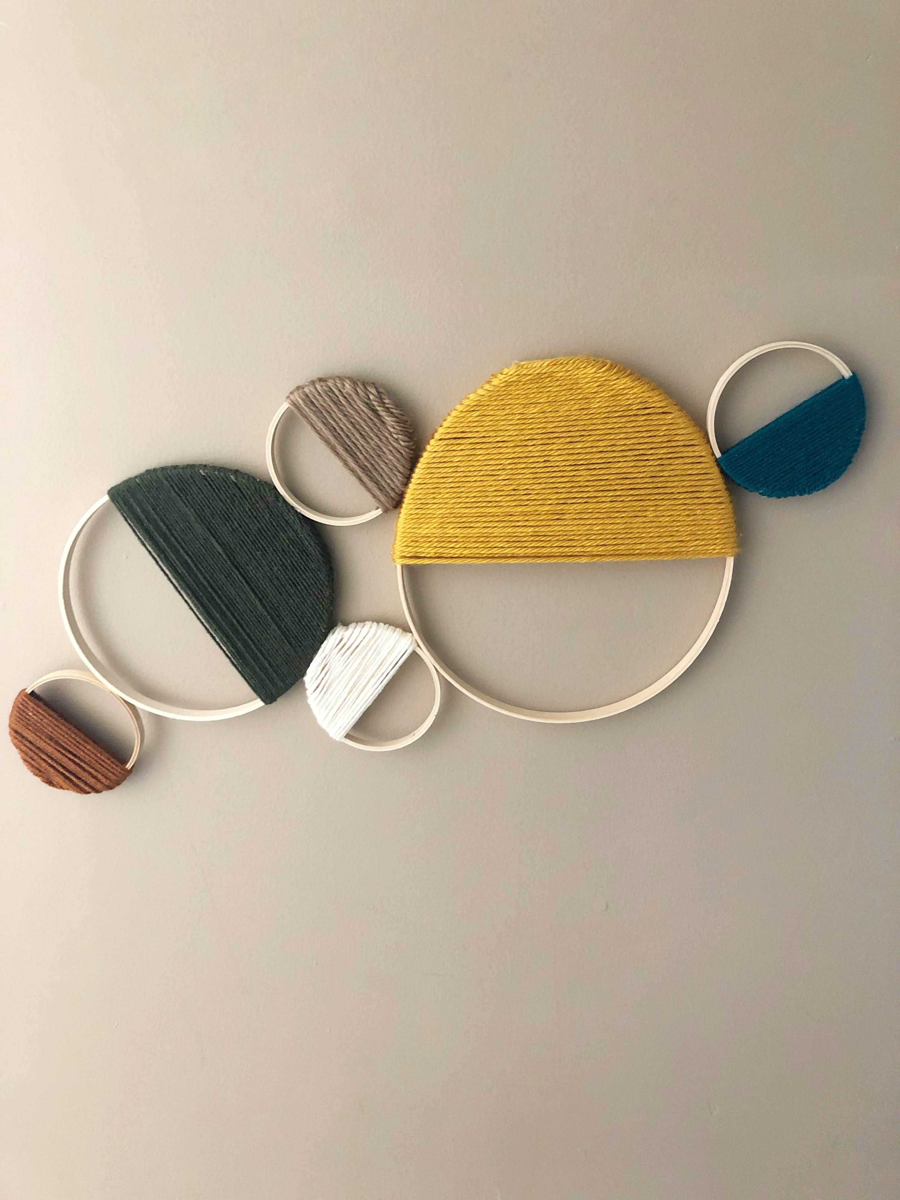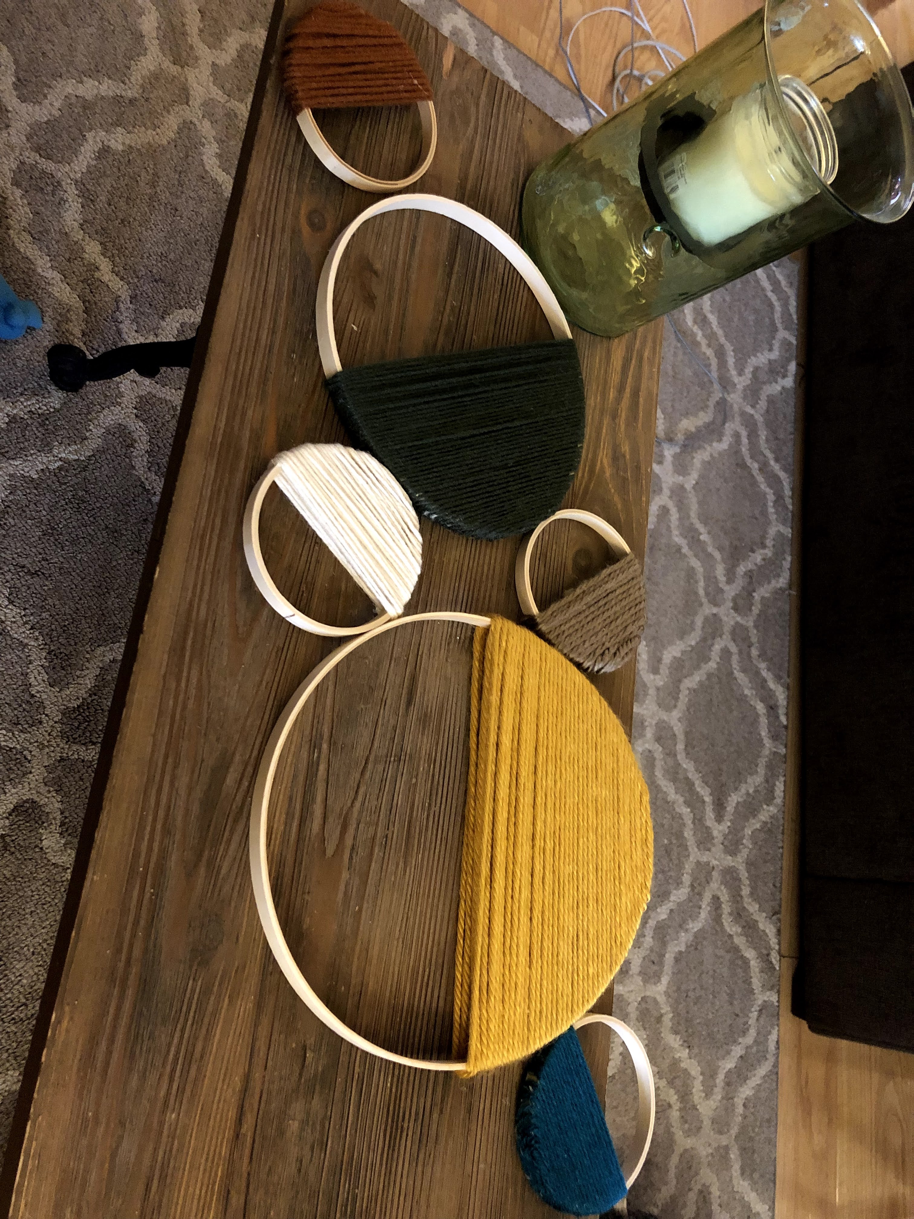 After that, some yarn art. Yarn art has been very popular this year as a way to add texture to a space. It’s affordable and relatively easy for a new DIYer or crafter. I found the original plans for this on Pinterest by Delineate Your Dwelling, and fell in love with the design. Basically you just wrap yarn around embroidery hoops tightly and hot glue it into place. The hot glue gun was my original power tool, and I’d spend hours at our craft table growing up gluing things together, making doll houses or little builds. I chose colors that would brighten up the space, but yet to me are timeless. It immediately added a quirkiness & color to the space.