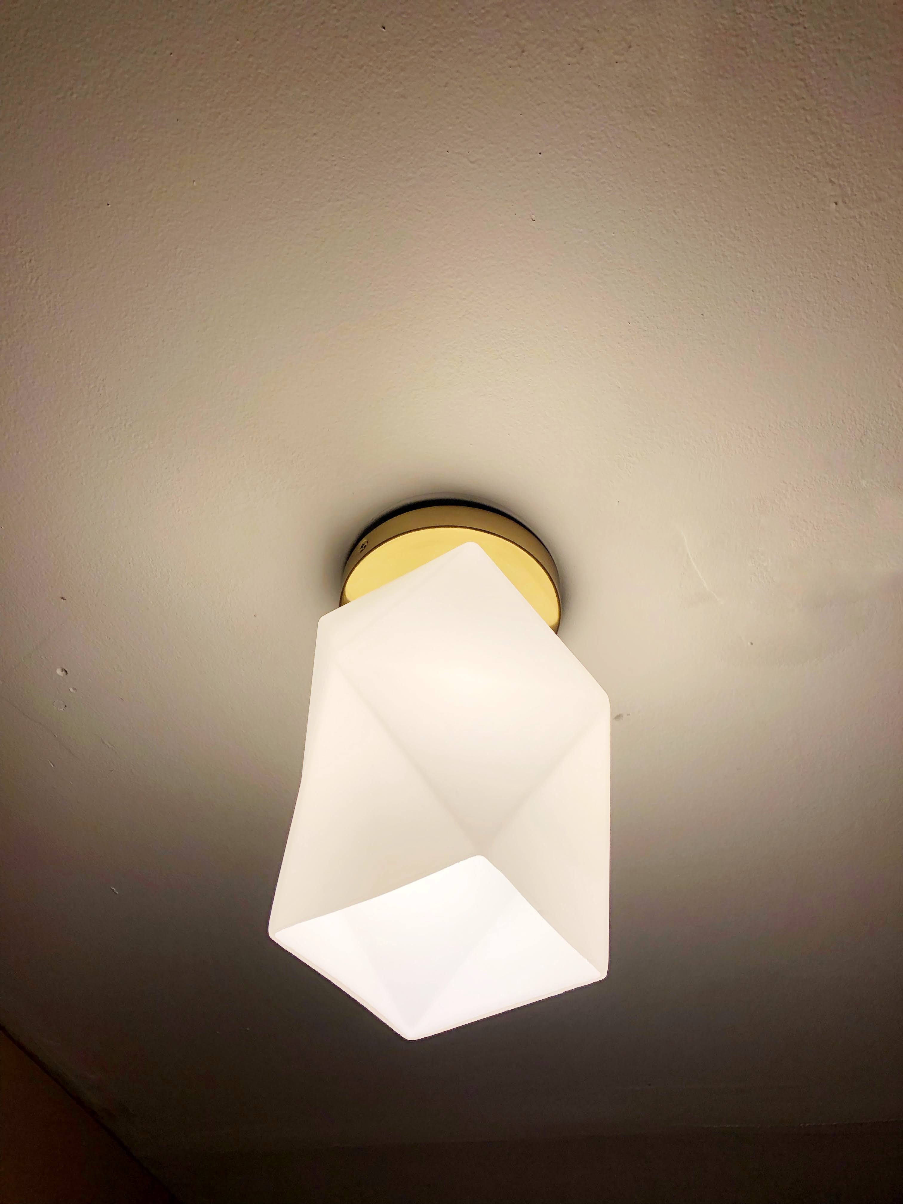 The last new item in this space is a light fixture. I knew I wanted something more unique than the cheap, round lights that were there. I found these geometric lights at Target, and I thought they would add another fun element to the space. This was my first time changing out a light fixture, and thankfully because it’s small and lightweight, it was not hard to do. I’ve seen my dad change out fixtures enough times that I knew the steps in the process, but I feel like there’s always some fear around electrical things. I cut the power off first, then removed the old light fixture. I put up the supporting bracket for the new one, and then lined up the cords, black with black, white with white, copper with copper. The hardest part was that the wire nuts that came with the light didn’t quite fit. Thankfully I had some that were slightly larger and was able to get the correct wires twisted together. After that, I just mounted the light to the supporting bracket, and we were good to go! The satisfaction in turning the power back on and seeing the light actually work was great.