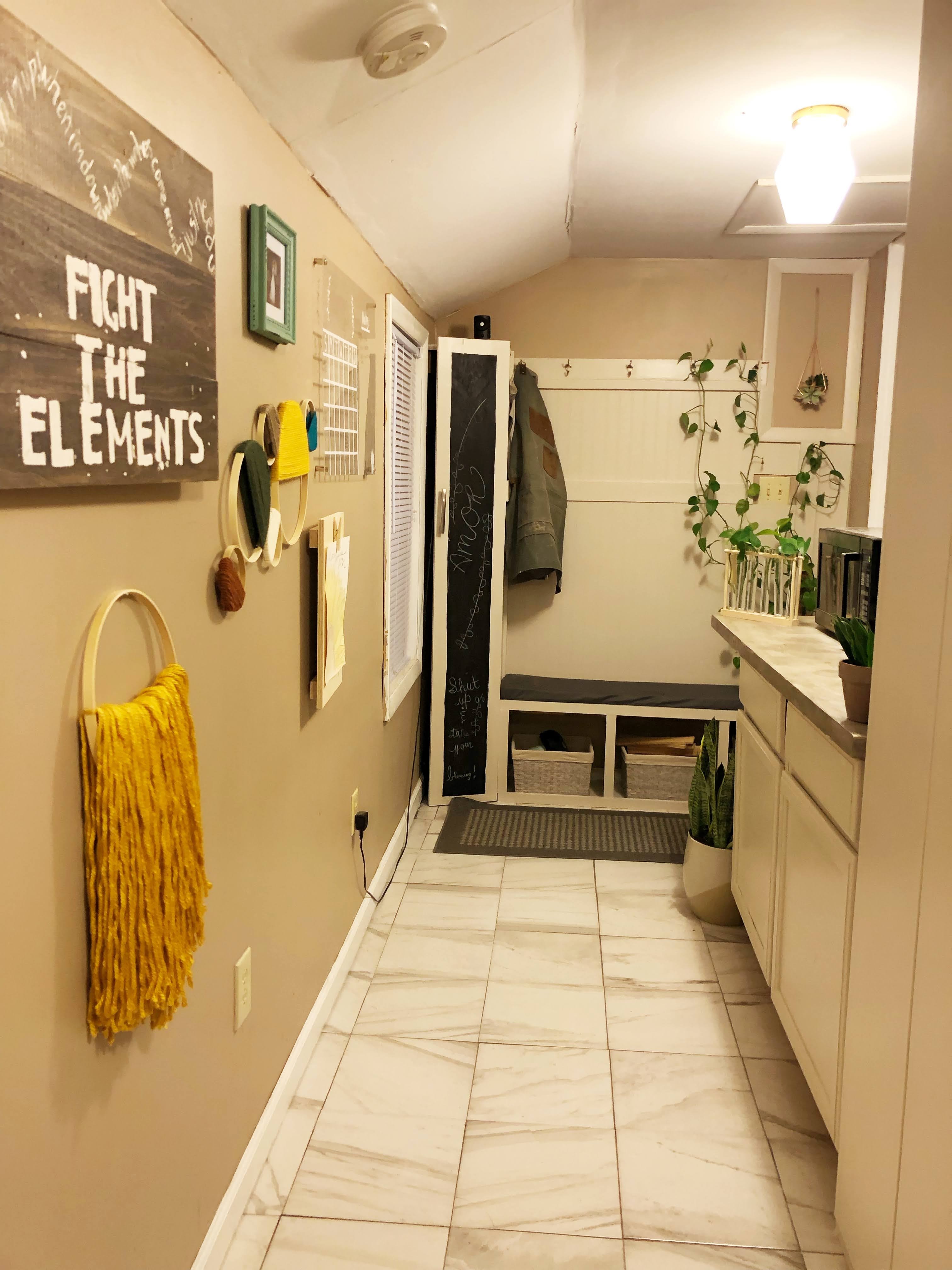 For my space, this week was a shift in focus on the small details, the elements that give a space life & personality. They are the things that make a space homey and tell our story. That includes new lighting, plants & decor (and baseboards, but that’s pretty basic). I intentionally kept this space pretty neutral. I wanted it to feel calm and peaceful right when we come in the door. Honestly it was starting to feel a little too neutral for my style though. It felt much more fancy & traditional than the rest of my house without the details. This was my chance to add in more color & texture in a way that wouldn’t feel overwhelming.