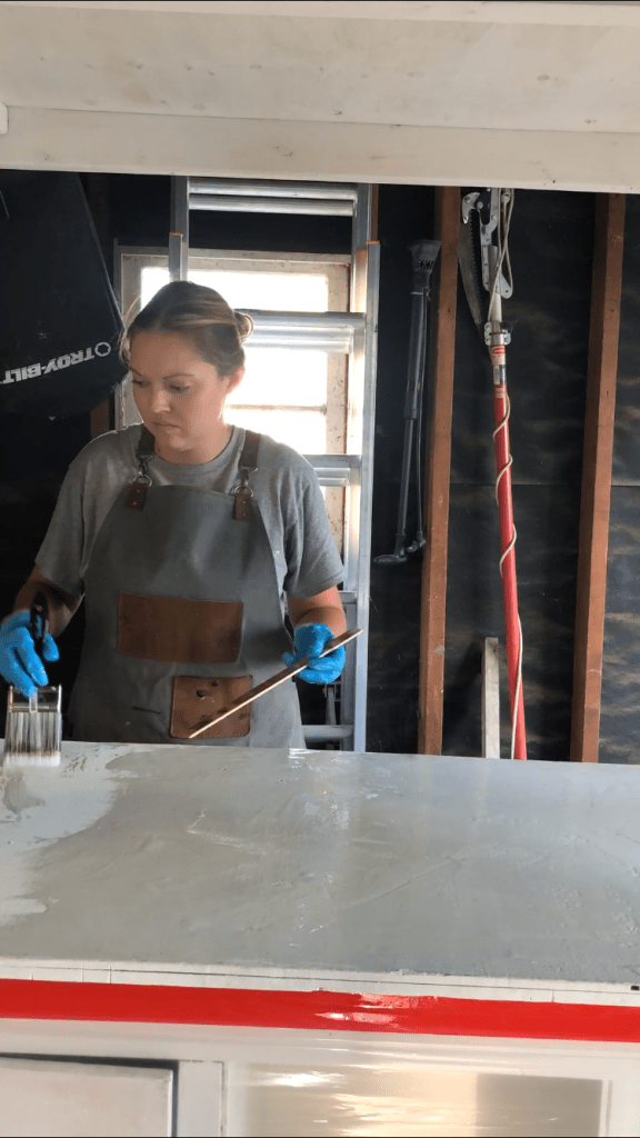 I used TotalBoat epoxy because I got to take a class with them at Haven conference, so I was familiar with the product. With epoxy you want to look for product that’s no VOC’s so you’re not breathing in anything harmful, keep hair or long sleeves pulled back, and always wear gloves. Following the manufacturer’s instructions is the best advice to keep you safe and not start a fire. For this countertop it was just two simple coatings, one to fill any pores in the wood, and then a flood coat on top. For exterior applications such as this one, you also need to apply varnish to make the piece UV resistant. This was the final step to making this flip a success.