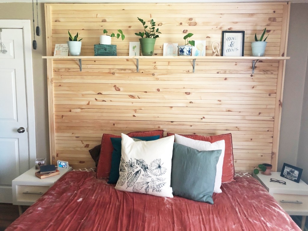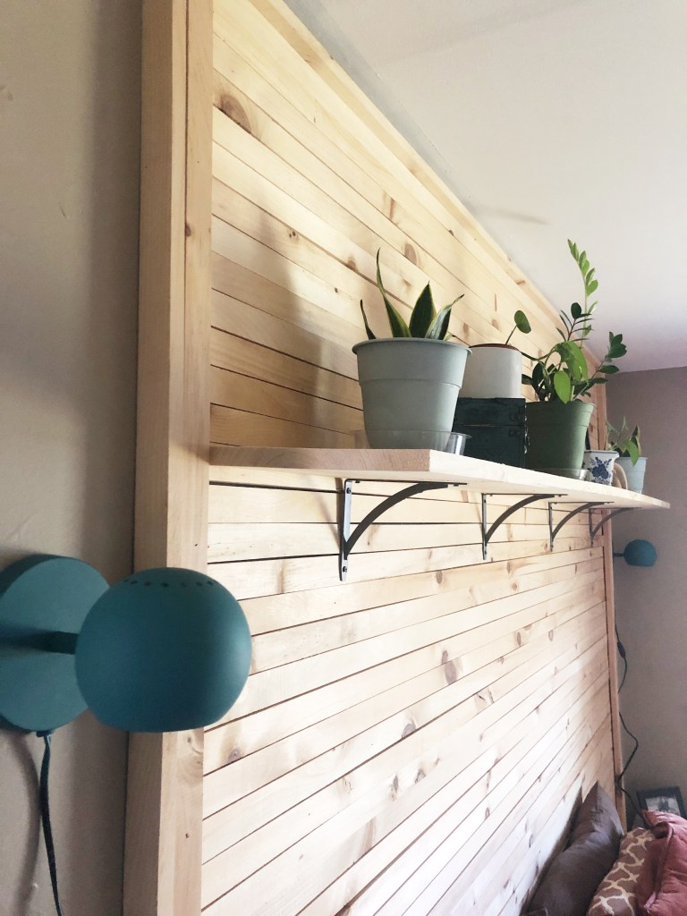 As is, the headboard wall made a dramatic difference in making this space feel cozy. Of course it wouldn’t be complete without a plant shelf and some sconce lighting. I made the shelf out of one board and some simple brackets. This room doesn’t get a ton of natural light, so all the plants I chose are low light tolerant. They also (at least according to the internet) purify the air.
