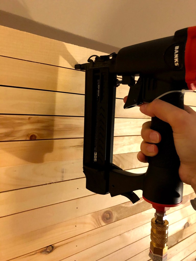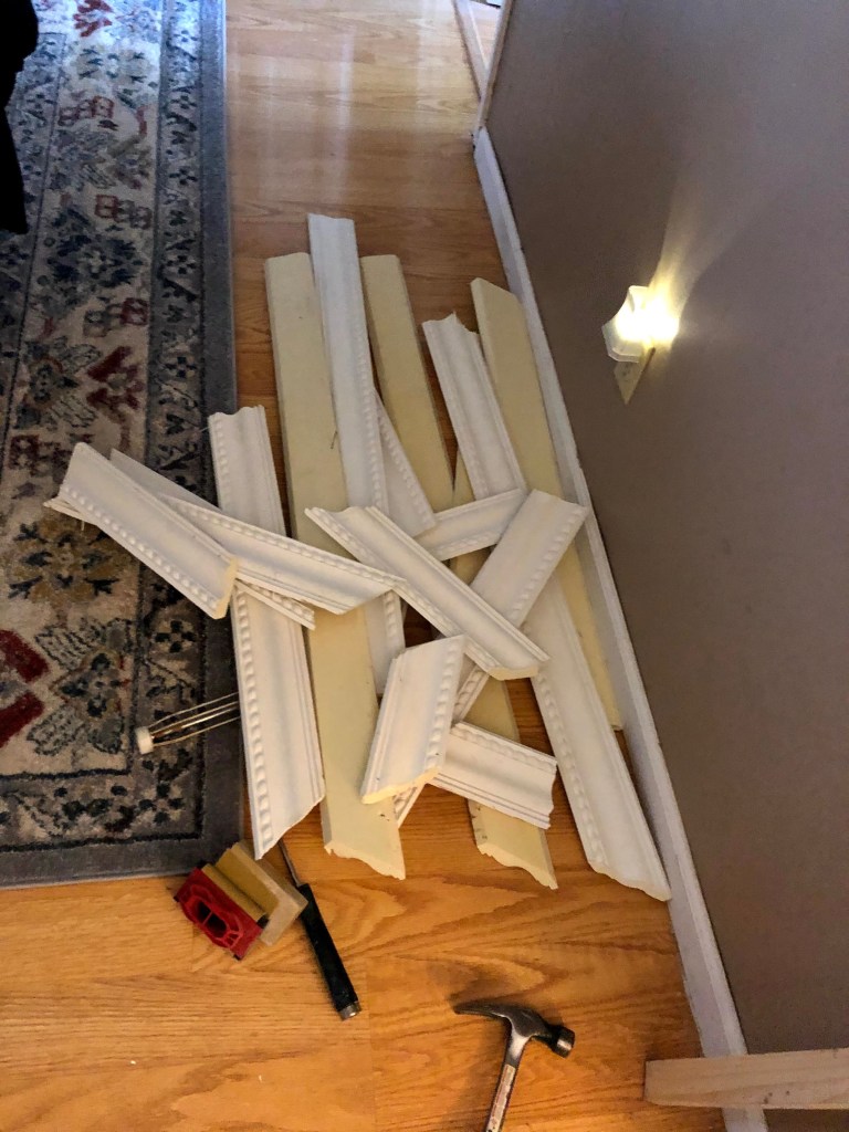 After a thick coat of primer and paint, and removing all of the awful crown molding, I got to work. I loaded up my sedan car with as many quality 1×2’s as I could fit through the middle. This took two trips and a few Starbucks drinks for energy. I used liquid nails and my pneumatic 18 gauge nail gun to attach each board to the wall. I used quarters as spacers between the boards. A few quarters might have slipped behind the wood haha.
