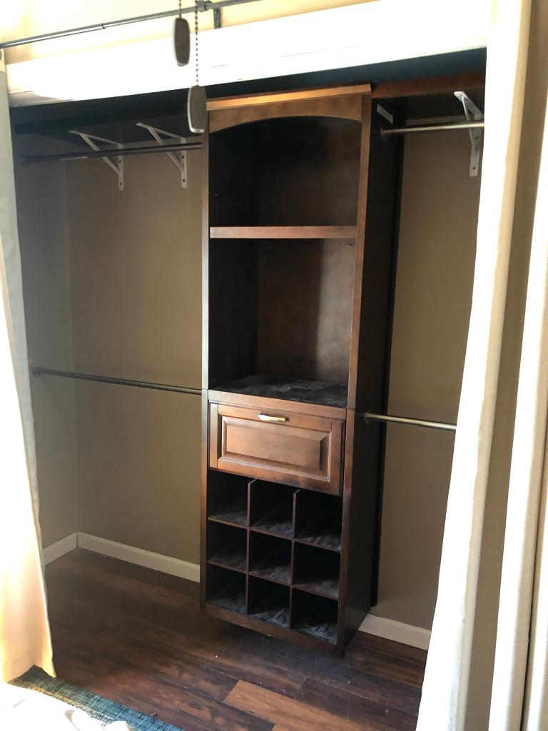 Anyway, what you’re really here for, the makeover. This closet was so incredibly dark and it made me feel like I couldn’t find anything. The house also came with accordion doors on the closet, that eventually broke off the track and hit me in the head. Like a sane person, once the doors hit me, I took them to the garage, ripped them down with a saw, and put them in the trash. For a while we had curtains hanging up, which you may now recognize as the curtains on the window.
