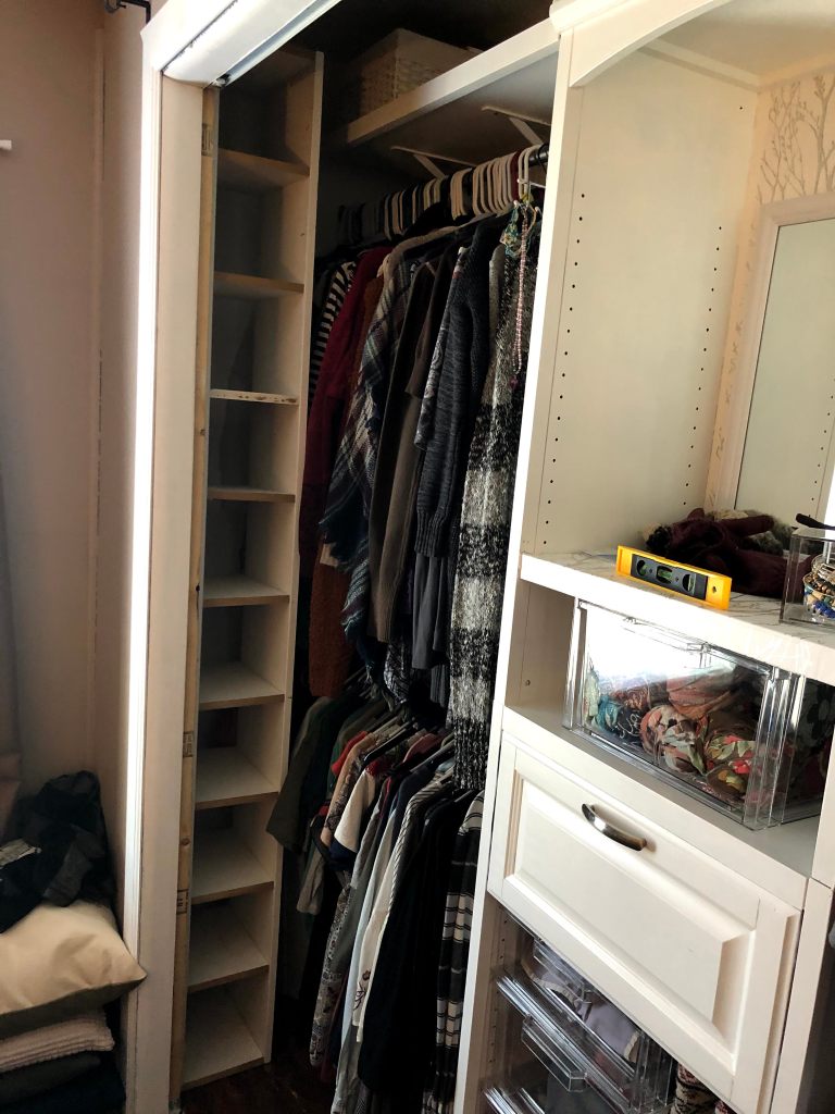Next was a mix of custom built and store bought storage. I’ll be the first to tell you I have many shoes. Maybe too many, but wearing unique and fun shoes is something that really sparks joy for me. Realizing I needed to take advantage of the vertical space in the closet (since it’s no Princess Diaries walk-in), I built my own shoe storage shelf out of MDF and attached it to the wall. It allowed me to fit all of my shoes in this space easily.