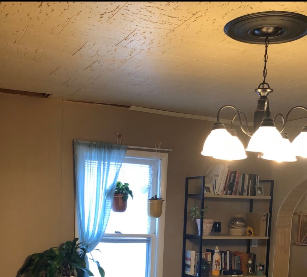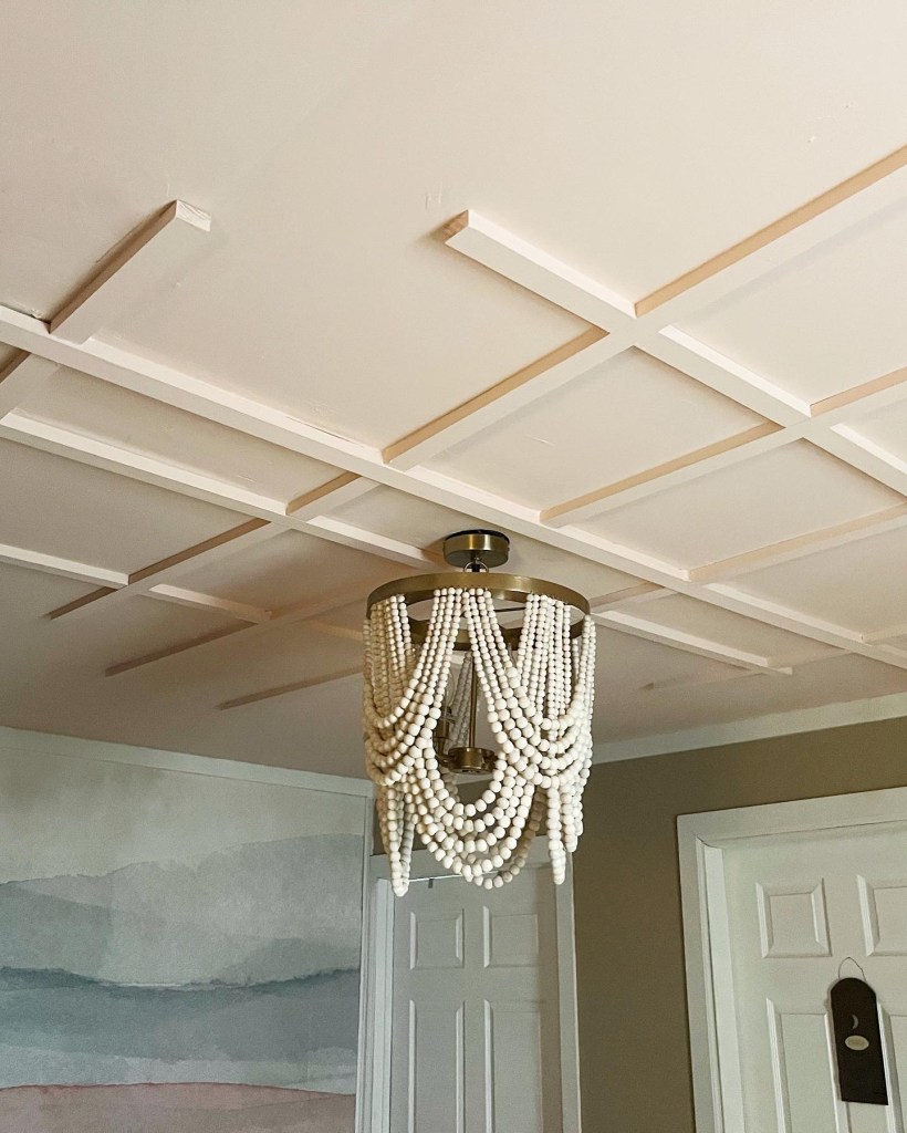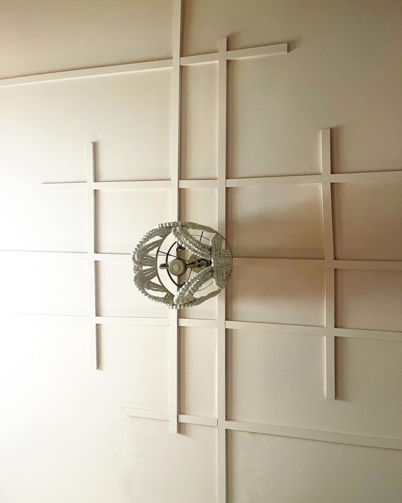 Last before primer & paint, I decided to create a simple ceiling art piece with 1×2 boards. Originally I was going to get a ceiling medallion and put it over the chandelier. But with this being the largest room in our home, my plans evolved. I started to think of the ceiling as the “fifth wall” of the room that could make a dramatic impact on design. I drew several sketches of potential layouts for this ceiling art install, but in the end I didn’t follow any plans. I hung the boards one or two at a time and slowly kept adding on where it felt right.
