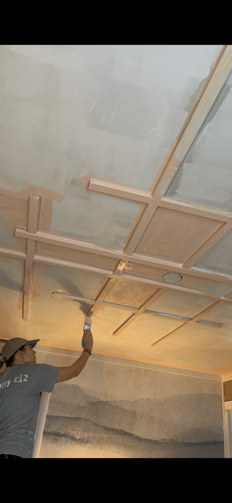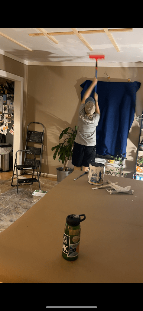 Since everything I installed was a raw material, it needed a good coat of primer before I could paint. I stayed up late one night to get this done, because admittedly my arms and shoulders had been getting very worn out and I was ready to be done with the ceiling. I chose a beautiful strawberry milk soft pink for the ceiling paint, and I instantly fell in love with the warm tones it pulled out of the room.