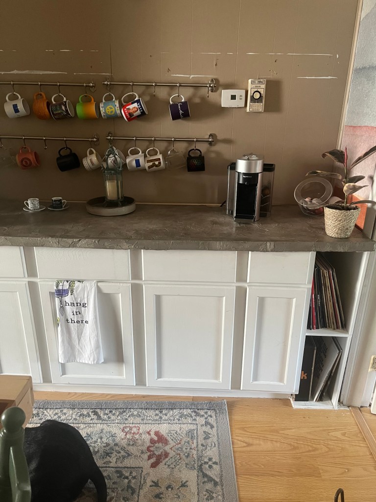 When we first moved into our house, there were two countertops stacked on top of each other in the back hallway, which is the space I took on last year for the One Room Challenge. A few years ago, I decided to build a coffee bar in our dining room in this weird nook that really had no other function. I used one of those stacked countertops for it because it was free, but my intention was always to find a way to resurface it. If you were around last year for the One Room Challenge, you might remember that I chopped a countertop in half and coated it in feather finish concrete.