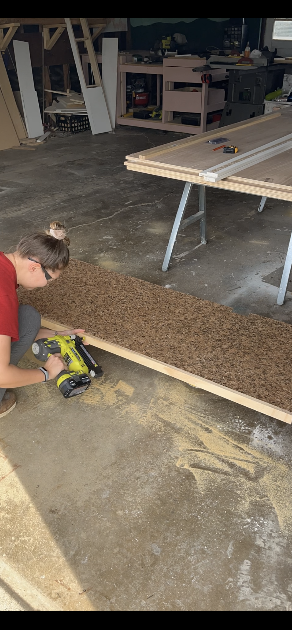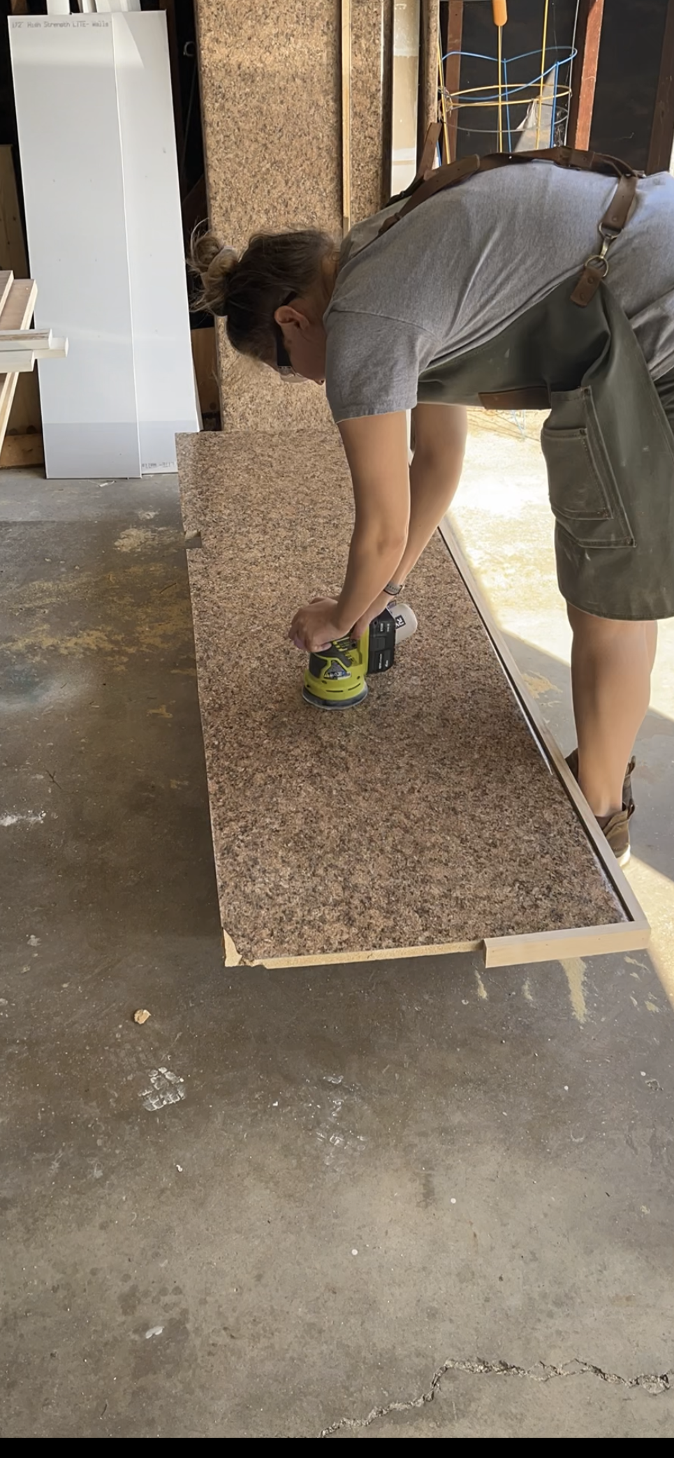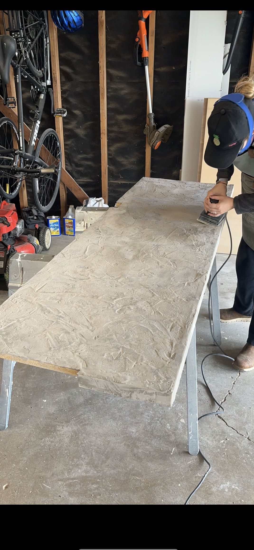 For the countertop, I applied two layers of it with a trowel. Something I did differently than last year was after the first layer, instead of letting it dry all the way before sanding, I wet sanded it. I used a specific sanding sponge that was meant for this purpose. It was way less messy and dusty than sanding it dry. After the second layer dried fully I did hit it with the power sander some, just to make sure it was smooth. Thankfully being outside and wearing a respirator mask, dust was not a concern.