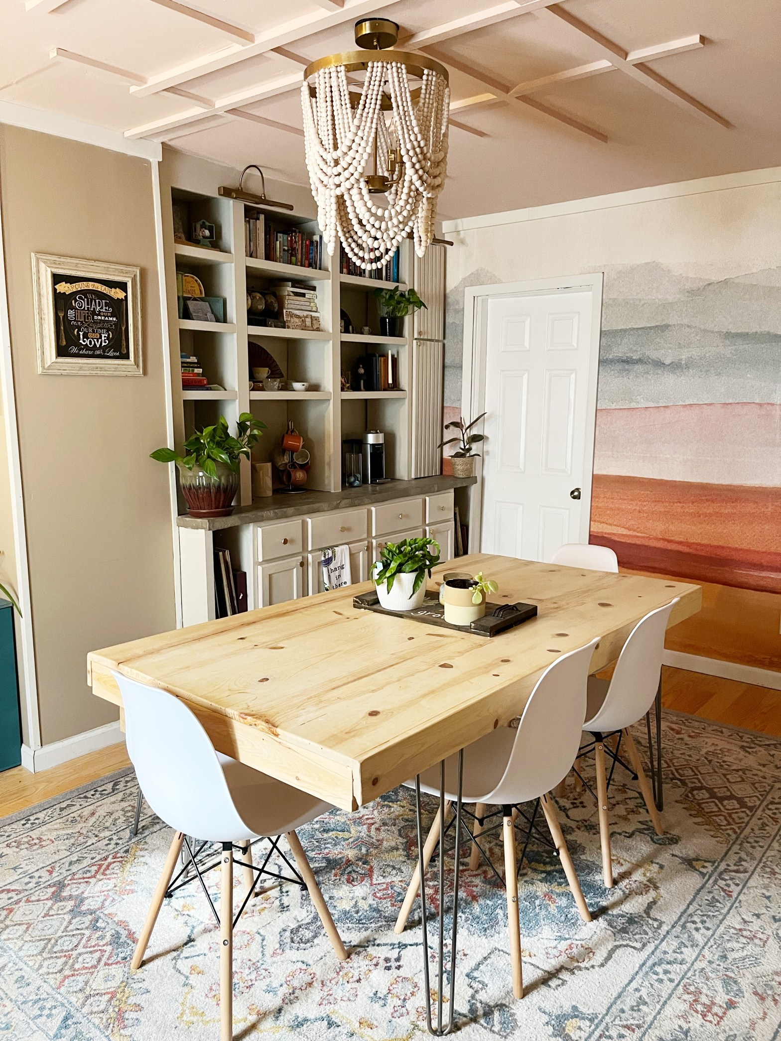 Dylan helped me hang my dream chandelier, and beautiful neutral beaded one. This whole ceiling, art, chandelier is probably the biggest transformation of this space, and although I wasn’t planning on it taking so long, I’m really glad I took the time to do it. I learned new skills, and created something original out of one of those crazy ideas swirling in my head. Other creatives may relate to the feeling of having constant project ideas in your head.
