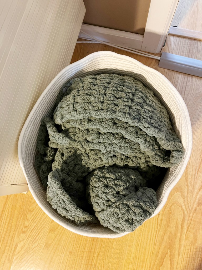 One of my organizational weak points is that I notoriously have a ton of throw blankets. I use them all year long, and I do not get rid of them often on my cleaning days. When I sit completely covered in a blanket, my husband always jokes that it means the house is a good temperature for everyone else. The plight of a person who’s always cold, I guess.